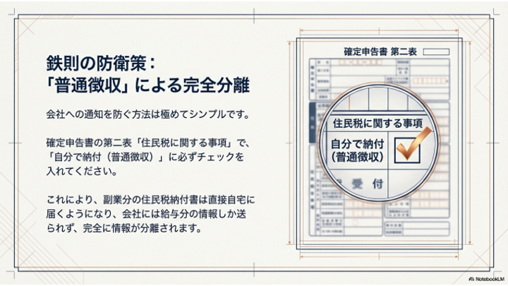 これを防ぐには、確定申告書の第二表にある「住民税に関する事項」で、「自分で納付(普通徴収)」に必ずチェックを入れてください。これにより、副業分の住民税納付書は自宅に届くようになり、会社には給与分の情報しか行きません。