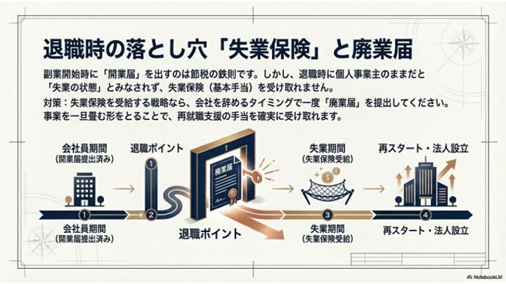 • 対策: 失業保険を受給する予定があるなら、会社を辞めるタイミングで一度「廃業届」を提出してください。