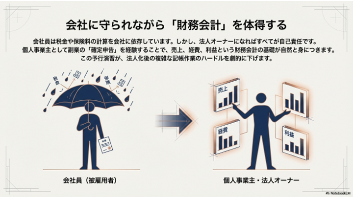 副業を行い、個人事業主として確定申告を経験することで、「売上」「経費」「利益」といった財務会計の基礎知識が自然と身につきます。この経験があるかないかで、法人化した後の記帳作業のハードルが劇的に変わります。