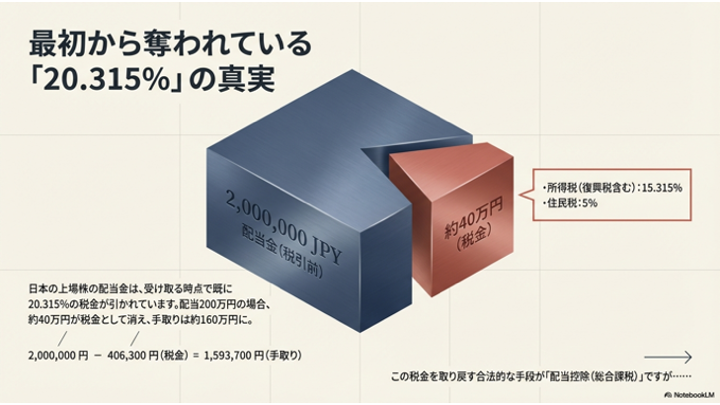 日本の株式配当には、最初から20.315%の税金がかかっています。